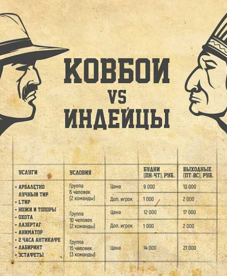 Вместе с лихим Ковбоем и отважным Индейцем участники делятся на команды, наносят боевой раскрас, наряжаются в ковбойские шляпы и перья.